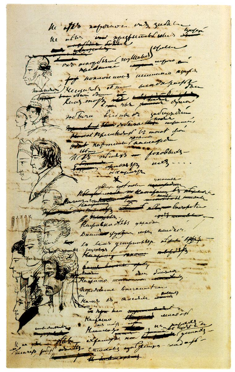 Slike: Puškinov autoportret, 1820; Puškinove skice na marginama rukopisa; Orest Kiprenski, Portret pesnika Aleksandra Sergejeviča Puškina, 1827; Edmund Dulak, Sam, 1900; Kaspar David Fridrih, Žena na prozoru, 1822.