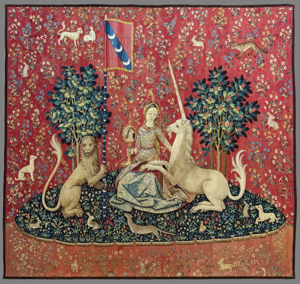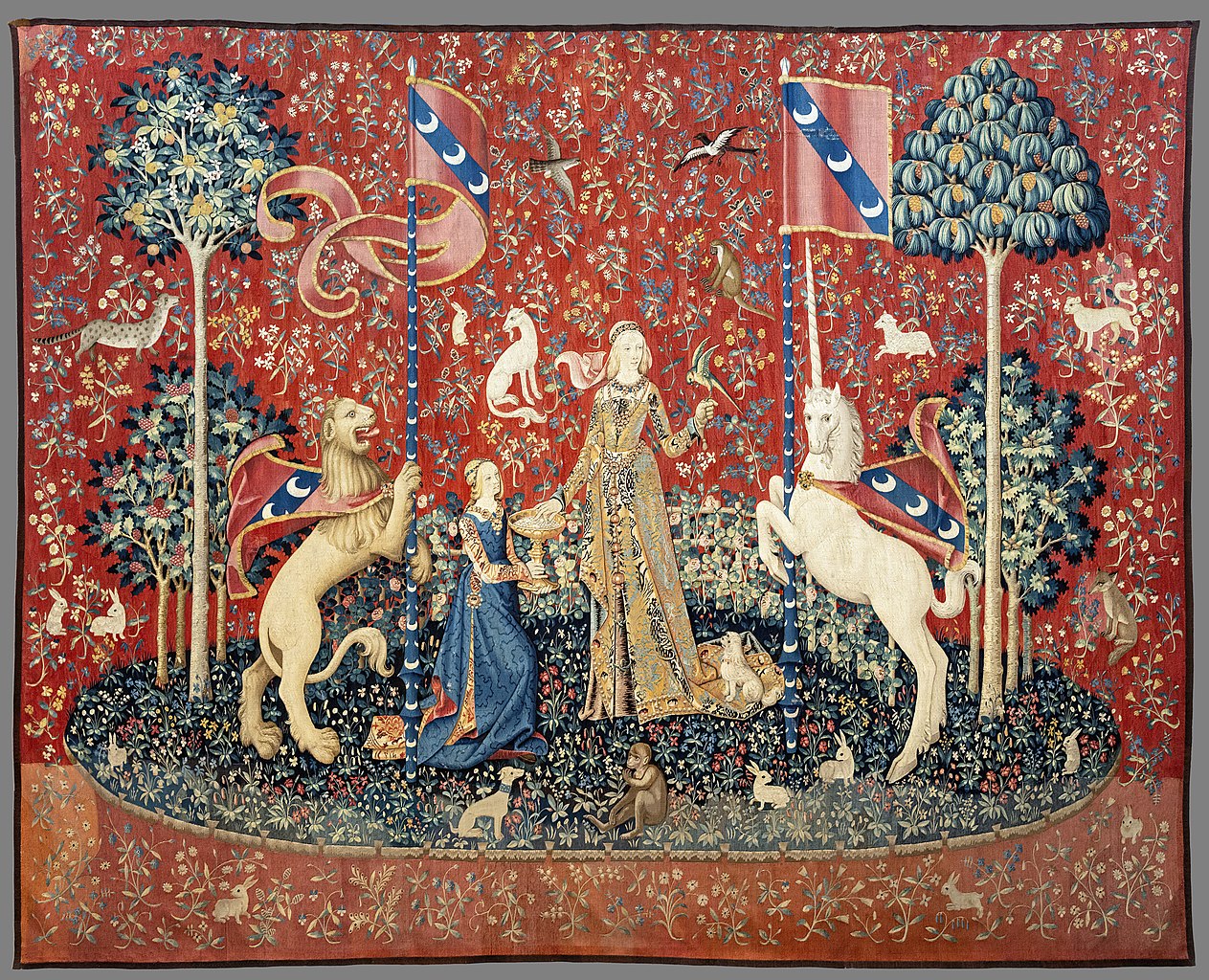 Slike (dole): Dodir, Ukus, Miris, Sluh, Vid, Mojoj jedinoj želji (À mon seul désir), dizajnirano u Parizu, tkano u Flandriji, oko 1500.