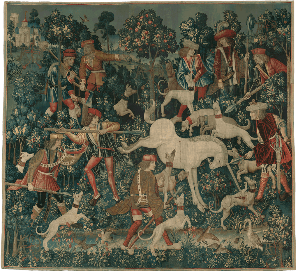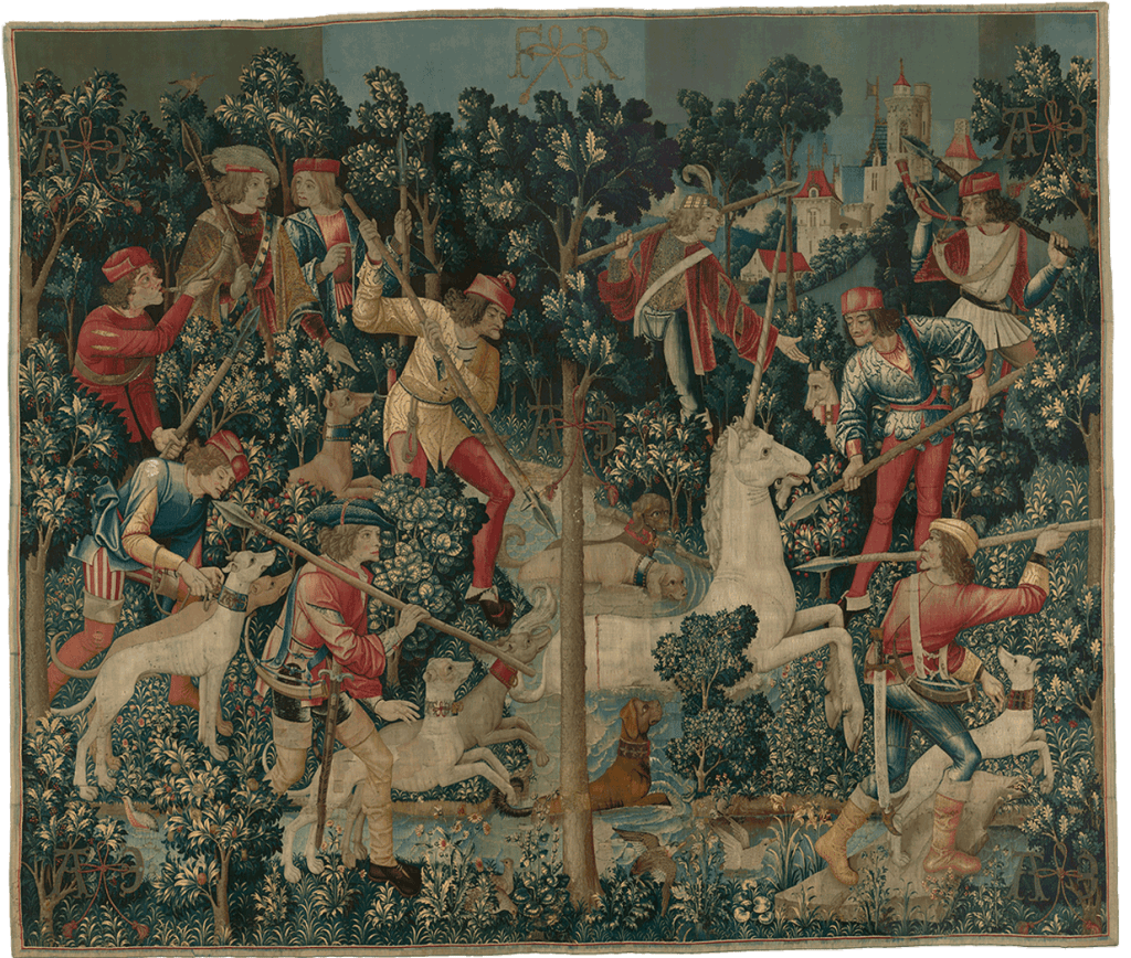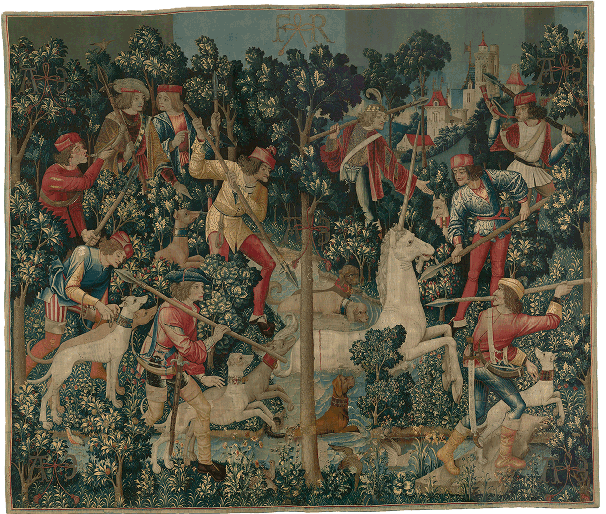 Na prvoj gornjoj tapiseriji koja pripada ciklusu od sedam tapiserija nazvanih Lov na jednoroga, a koje se nalaze u njujorškom Metropoliten muzeju, vidimo mitsko biće kako svojim rogom pročišćuje vodu sa izvora. U njegovoj simbolici susreću se antička misao, hrišćanska predaja i ezoterijska učenja. U mnogim tradicijama jednorogov rog viđen je kao pehar koji ozdravljuje. U crkvenoj alegorici kako bi se jednorog uhvatio u polje se dovodi devica, kojoj životinja sama dolazi i kada legne u njeno krilo biva uhvaćena.