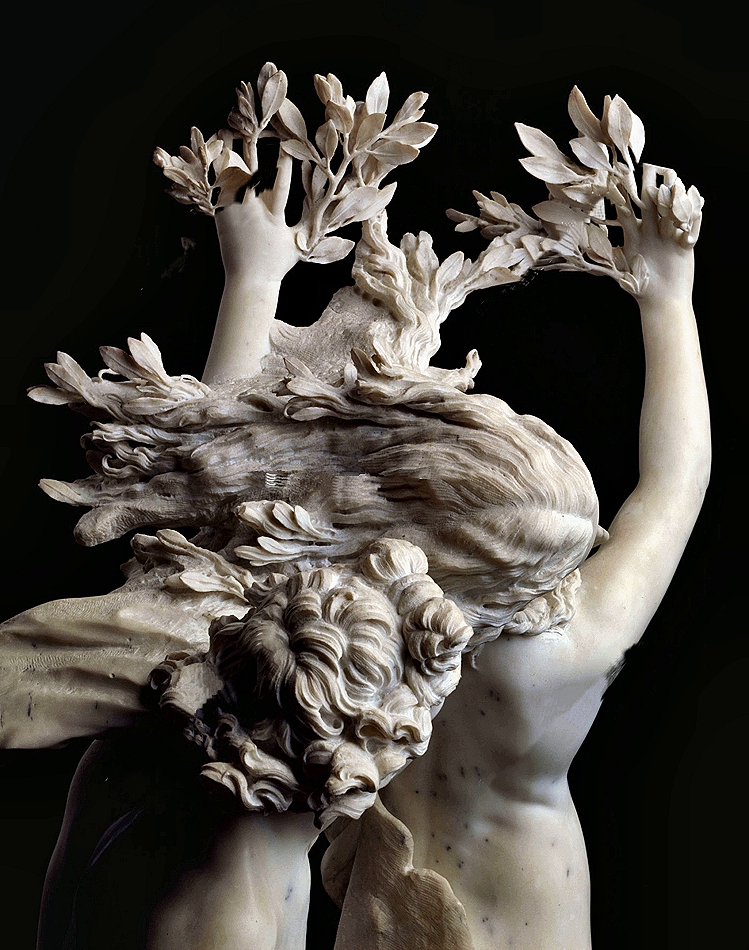 Možda bismo priču o Apolonu i Dafne, o njegovoj naklonosti i njenom okrutnom stradanju, mogli nazvati Pusti me da plačem, prema nazivu jedne kompozicije iz Hendlove opere Rinaldo koju je u našem vremenu reinterpretirao i oživeo Lars fon Trir u filmu Antihrist? Bernini oblikuje nimfin poslednji uzdah dok gipko telo prerasta u lovorovo drvo čiji će splet listova Apolon sebi staviti na čelo, noseći venac poput krune, kao zaštitni znak pesnika i poklonika Lepog. Kasnije, lovorov venac, iz potpuno drugačijih pobuda, sebi umesto zlatne krune (ili u pozlaćenom obliku) stavljaće vladari Rima na čelo. Treba znati odakle dolazi poklič sujeti, odakle baš takva kruna i šta je rezultat trijumfa. Dok Had otima Persefonu, on na glavi ima krunu koja se dodatno sjaji njegovom grimasom – trijumfom nad telom koje mu se opire. Ovde je scena identična.