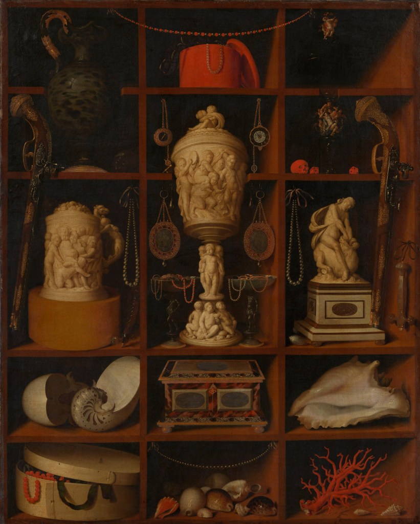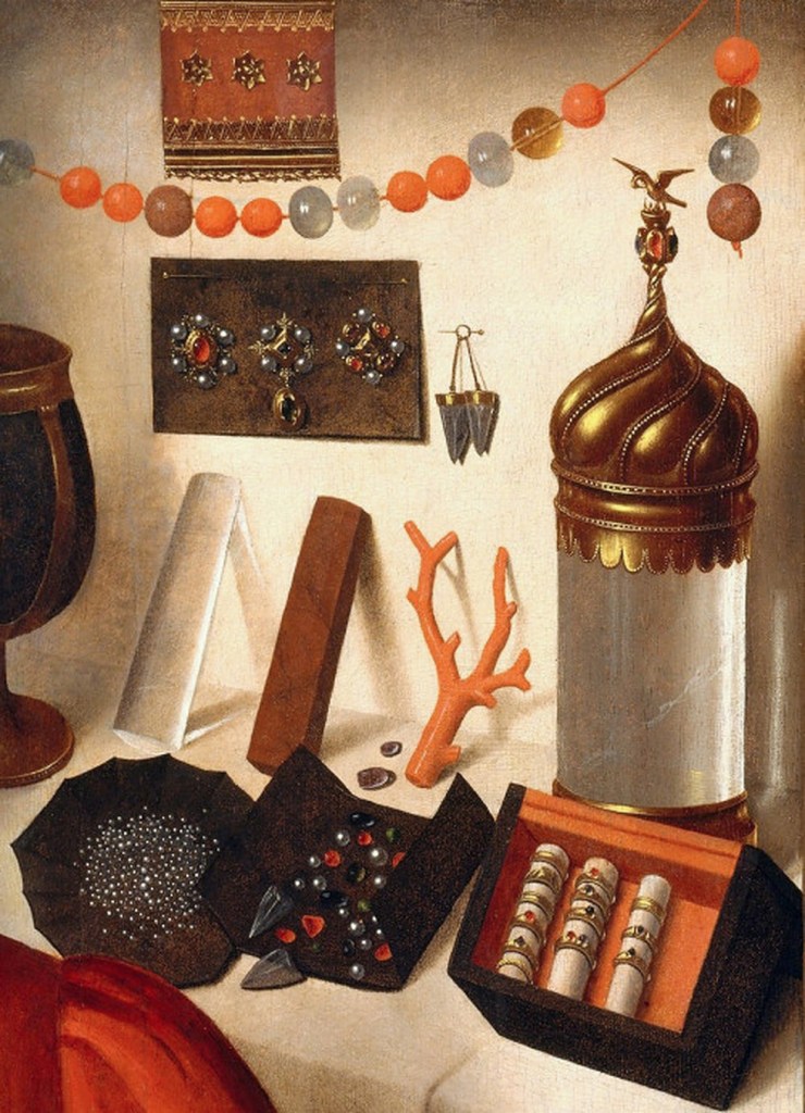 Slike: Lavinia Fontana, Portret Antoanete Gonsales, 1595; Đuzepe Arčimboldo, Vertumnus – Portret Rudolfa II, 1591; Paolo Veroneze, Portret skulptora Alesandra Vitorija, 1580; Đanbatista Moroni, Portret skulptora Alesandra Vitorija, 1552; Johan Georg Hajnc, Kolekcionarski kabinet, 1664; Petrus Hristus, Zlatar, 1449. (detalj); Domenico Remps, Kabinet kurioziteta, 1695; Anne Vallayer-Coste, Korali i školjke, 1769;