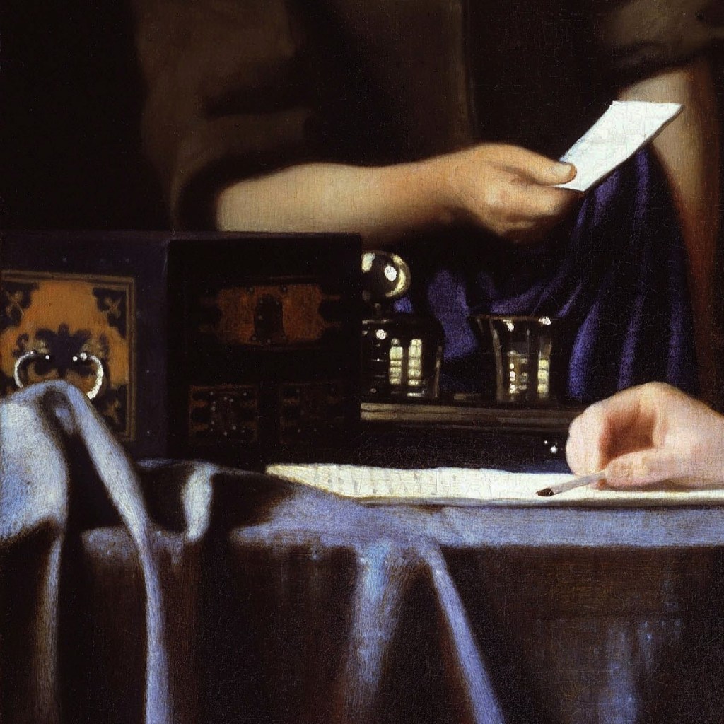 Pojedini umetnici moraju da sačekaju druge umetnike ili kritičare nekoliko vekova ne bi li njihova dela bila adekvatno osvetljena, ne bi li draperija, nalik onima koje je Vermer slikao, bila do kraja povučena, ne bi li do kraja osvetlila značenjski prostor slike. Odnosi Džejmsovih i Prustovih junaka, fizički posmatrano, mogu imati slilčan položaj Vermerovim naslikanim parovima. U pitanju su susreti koje svetlost, ono što određuje atmosferu, čini dvosmislenim, a takvi su odnosi i mnogih parova ova dva pisca. Otuda toliko orijentalnih stolnjaka: emocija vez je lavirintski složen i u toj tišini on je njihovo glasilo.