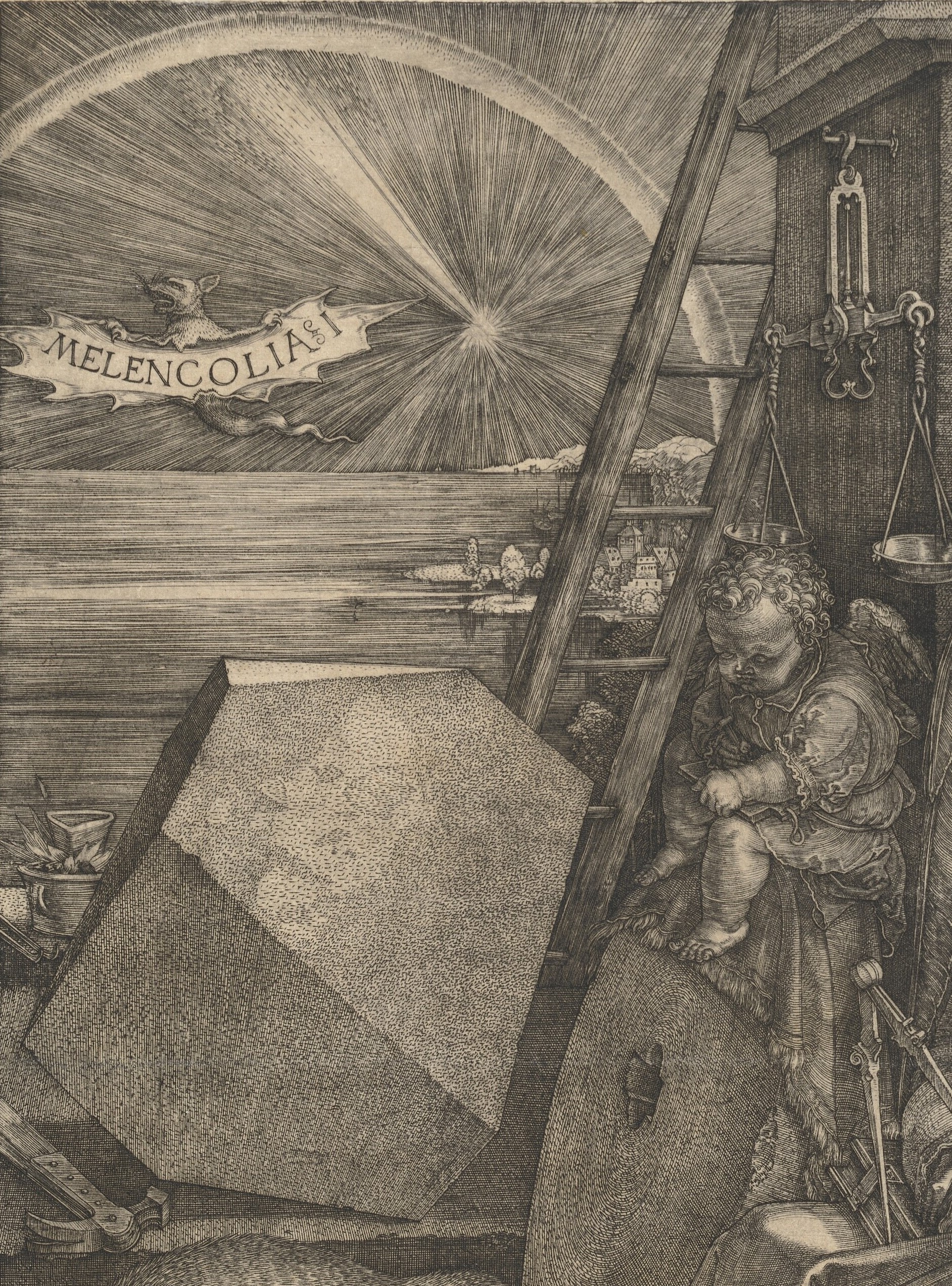 Direrova Melanholija ima modrinu u licu, crnoputost. Zamišljena glava pridržavana je rukom u karakterističnoj pozi. U ruci drži instrumente za merenje i brojanje. Pored nje je torba za brojanje novca. Oko nje su alatke kakve bi zanatlija koristio. Očigledno je melanholik okarakterisan fizičkim tipom, položajem tela i zvanjem stare loše melanholije. Ali kao da, ovde, predstavlja nešto uzvišenije i intelektualno podvižnije. Ona ne radi ništa, samo sedi i razmišlja. Šta znače te geometrijske forme i zašto se lestvice uzdižu ka nebu iza poliedra?