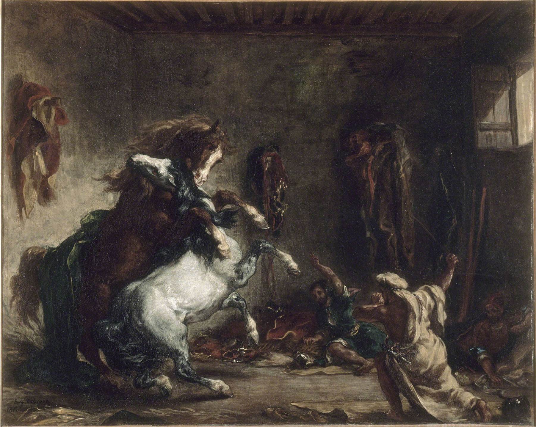 Delakroa je grandiozan. Ovde nije reč o kvalitativnim odlikama njegovog stvaralaštva već o veličini slika koje kao takve utiču na posmatračev doživljaj teme. Za recepciju je važno slikarevo predstavljanje scene u određenom formatu i zašto odlučuje da neka dela, bez obzira na temu, budu u malom formatu, dok druga stavlja u grandioznom. U pitanju je vizija, poput one u kojoj se arapski konji tuku u štali. Ona je divlja i nejasna, ali čini da odnos dinamike same scene i veličine platna bude koherentan.