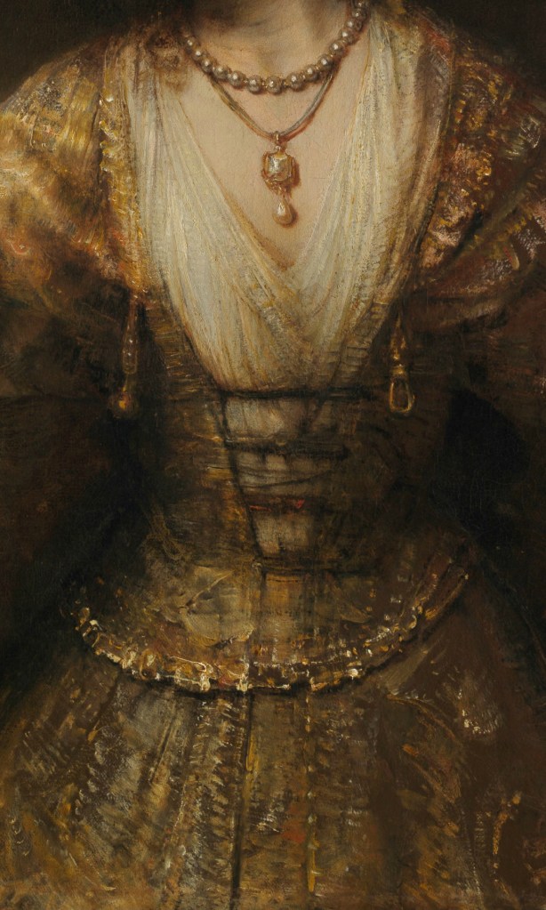 Jedna knjiga posvećena Rembrantu zove se Misterija otkrivene forme i mi možemo lako razumeti naslov te monografije ukoliko dobro osmotrimo detalje priloženih portreta. Oni su deo biblijske ili mitološke scene, ali se mogu odnositi i na građane tadašnjeg Amsterdama, naročito rana Rembrantova dela. Njegovom paletom dominiraju tamne boje, uglavnom crna i crvena, a lica i tela prikazanih deluju vazdušasto, kao da su slikana dahom. Posmatrač ne vidi jasne linije na tim platnima. Meke, prelazne, poput isparenja, konture Rembrantovih portretisanih tvorene su gustim nanosima boja. Linije se ne pojavljuju u svom pravom značenju, već više kao posledica prelaza boja. Priloženi primeri samo su detalji portreta ali dovoljno svedoče o istoriji mode, o društvenim uslovima u kojima se formirao slikar, o njegovim stvaralačkim odlikama i, najzad, o njegovom shvatanju ženstvenosti i lepote.