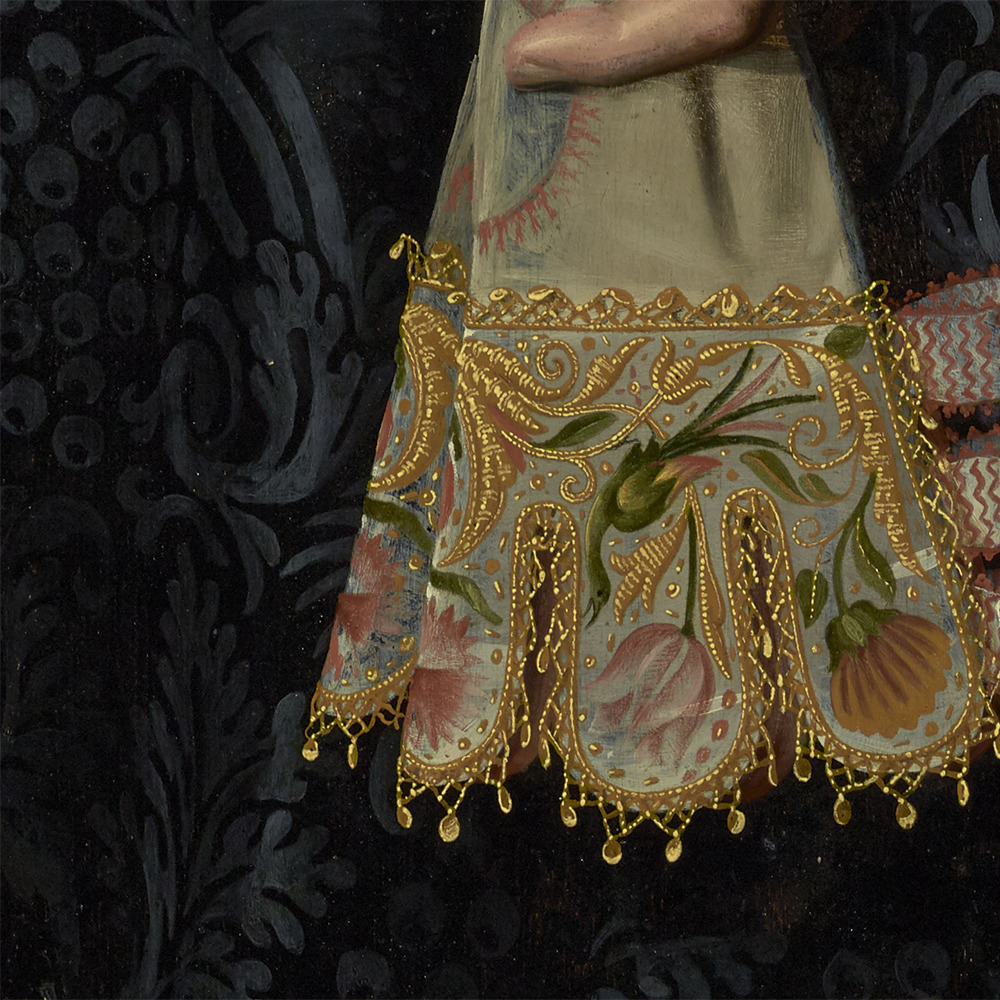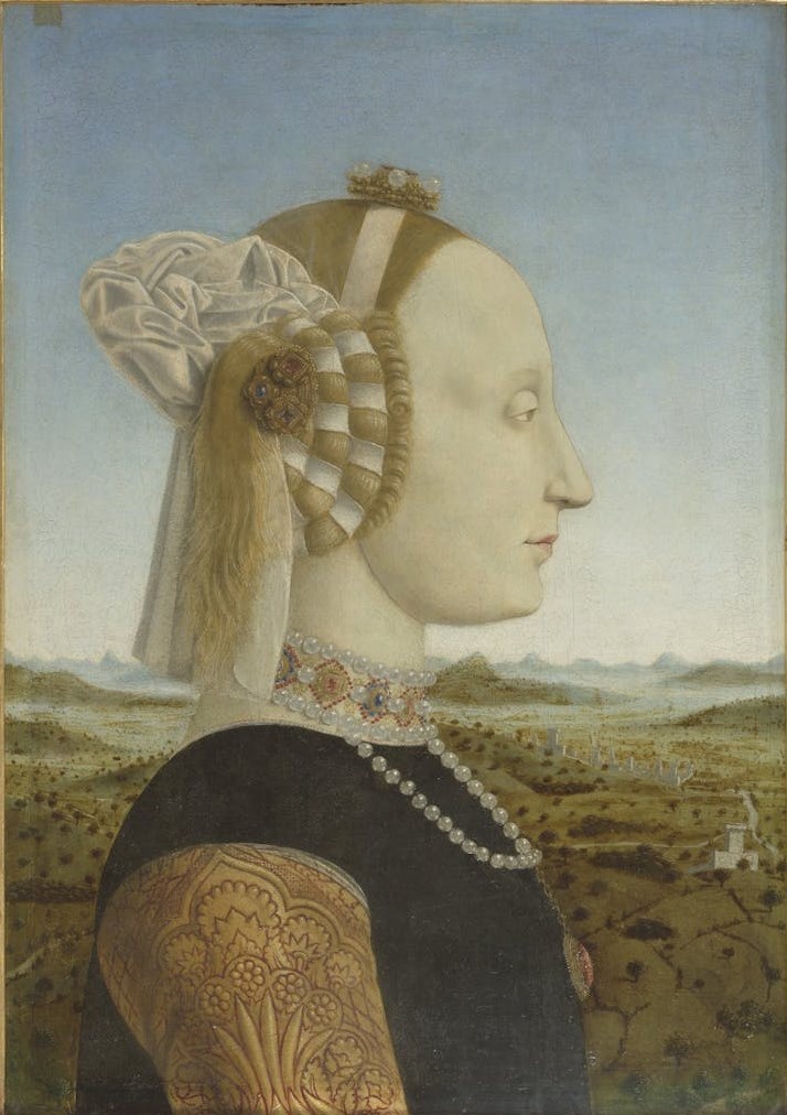 Možemo se diviti portretu Batiste Sforce koji je načinio Pjero dela Frančeska i pitati se ko je bila ona. Ili, pak, njena frizerka? Kada je ona morala da ustane da bi portretisanu pripremila za poziranje? Pogledajmo tkaninu unutar pramenova koji joj prekrivaju uvo. Zatim, šnale na glavi i nakit. Koliko je juvelira radilo na njima? Uočimo svu ornamentiku veza na rukavu haljine i diskretnu kontrast crne boje haljine i zlatne boje rukava. Ogrlica koju nosu jedna je od najlepših ikada prikazanih u zapadnom slikarstvu.