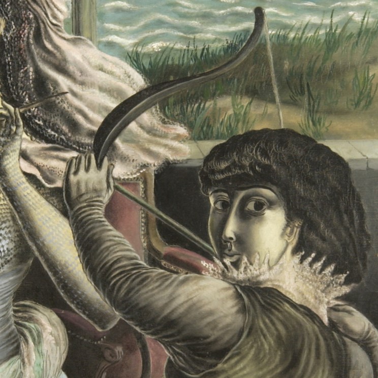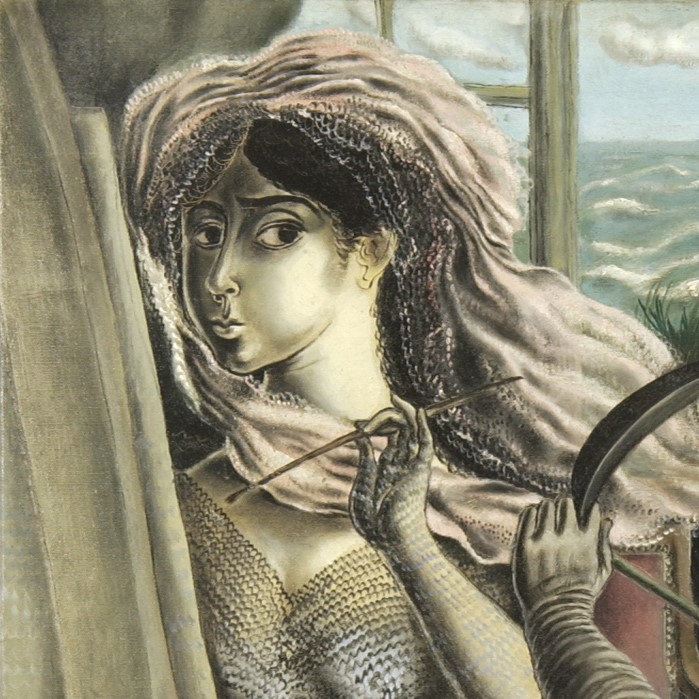 Slikarka na slici, romantično umotana u čipke, nabore, velove i sitne uvojke, ima idealizovan lik umetnice i stešnjena je u uskom prostoru između uspravne kosine štafelaja, horizontala prozora iza kojeg se vide pusta obala i more i figure strelca. Ona slika tankom četkicom koju drži kao strelicu: potez koji će naneti očito će biti disciplinovan i precizan pa je njemu primeren i uzdržan zamah ruke u čipkastoj rukavici. Ali ona ne gleda u sliku, već plaho i iskosa gleda u strelca koji sa razapetim lukom kleči do nje, pogledom koji nije samo pogled umetnika dok koncentrisano gleda svoj model već i pogled nekog ko sa zebnom očekuje odgovor drugog.