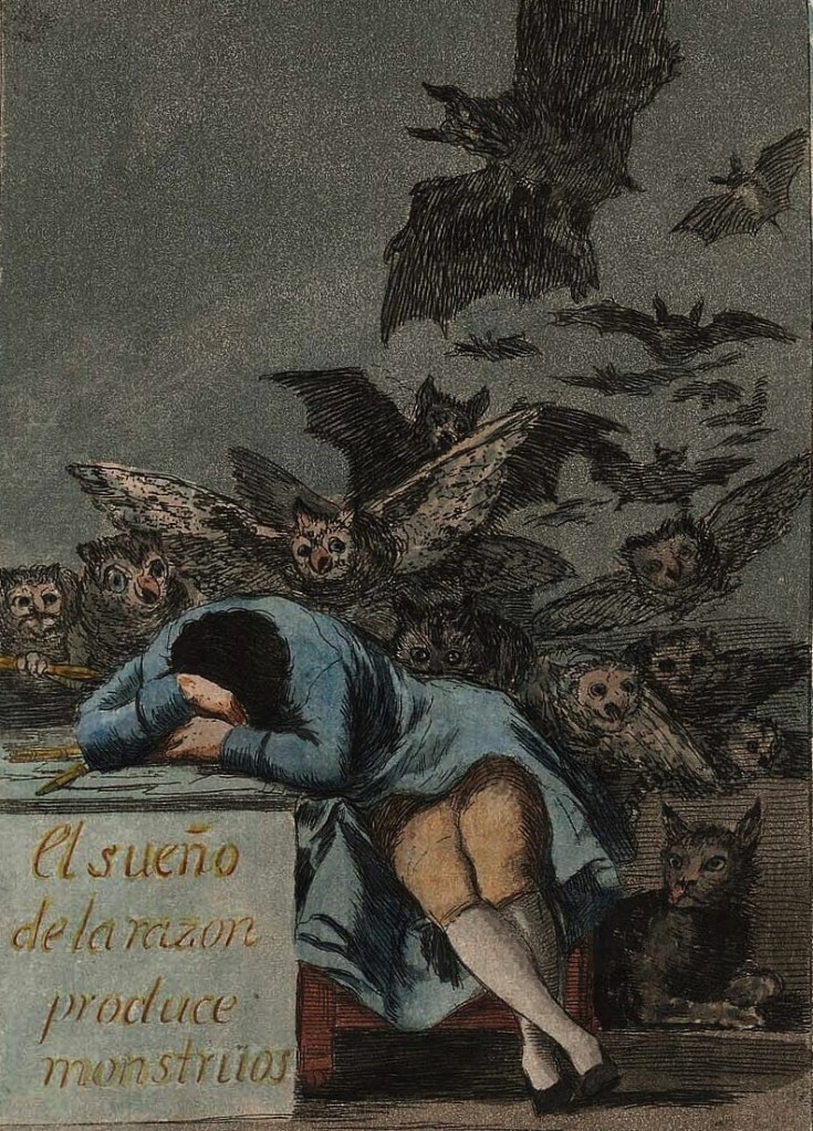 Mi smo naviknuti na prosvetiteljsko objašnjenje potpisa pod četrdeset trećim kapričom: kad razum spava bude se vampiri, kad se razum probudi, oni bivaju prognani. Dole predrasude i sujeverja! Takva interpretacija nije u skladu ni sa intencijom a ni sa Gojinom realizacijom. O tome svedoči i umetnikov retko citirani komentar koji dolazi uz taj crtež: „Fantazija koju je napustio razum stvara nečuvena čudovišta: ujedinjena sa njim, ona postaje majka umetnosti i izvor njenih čuda.“