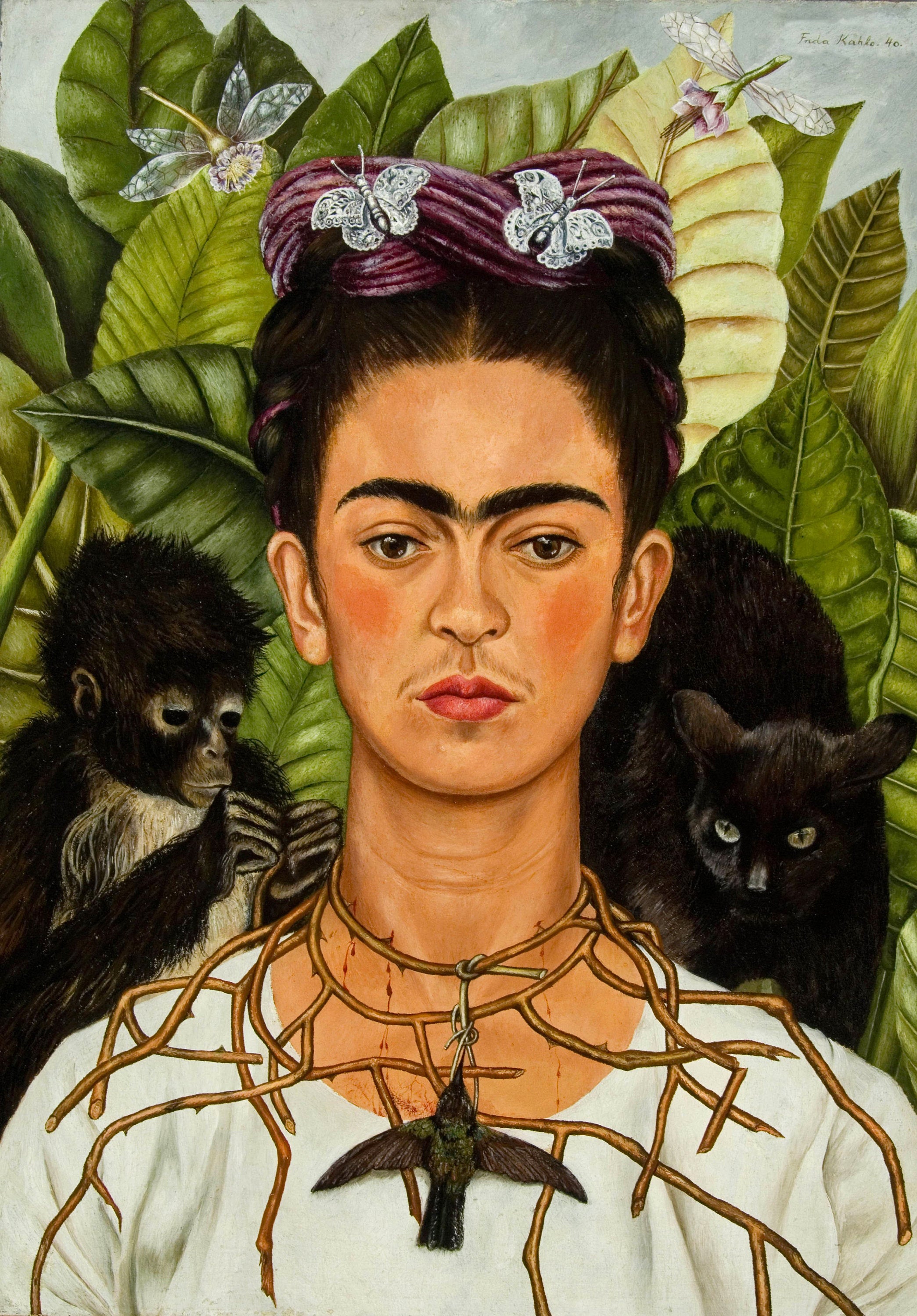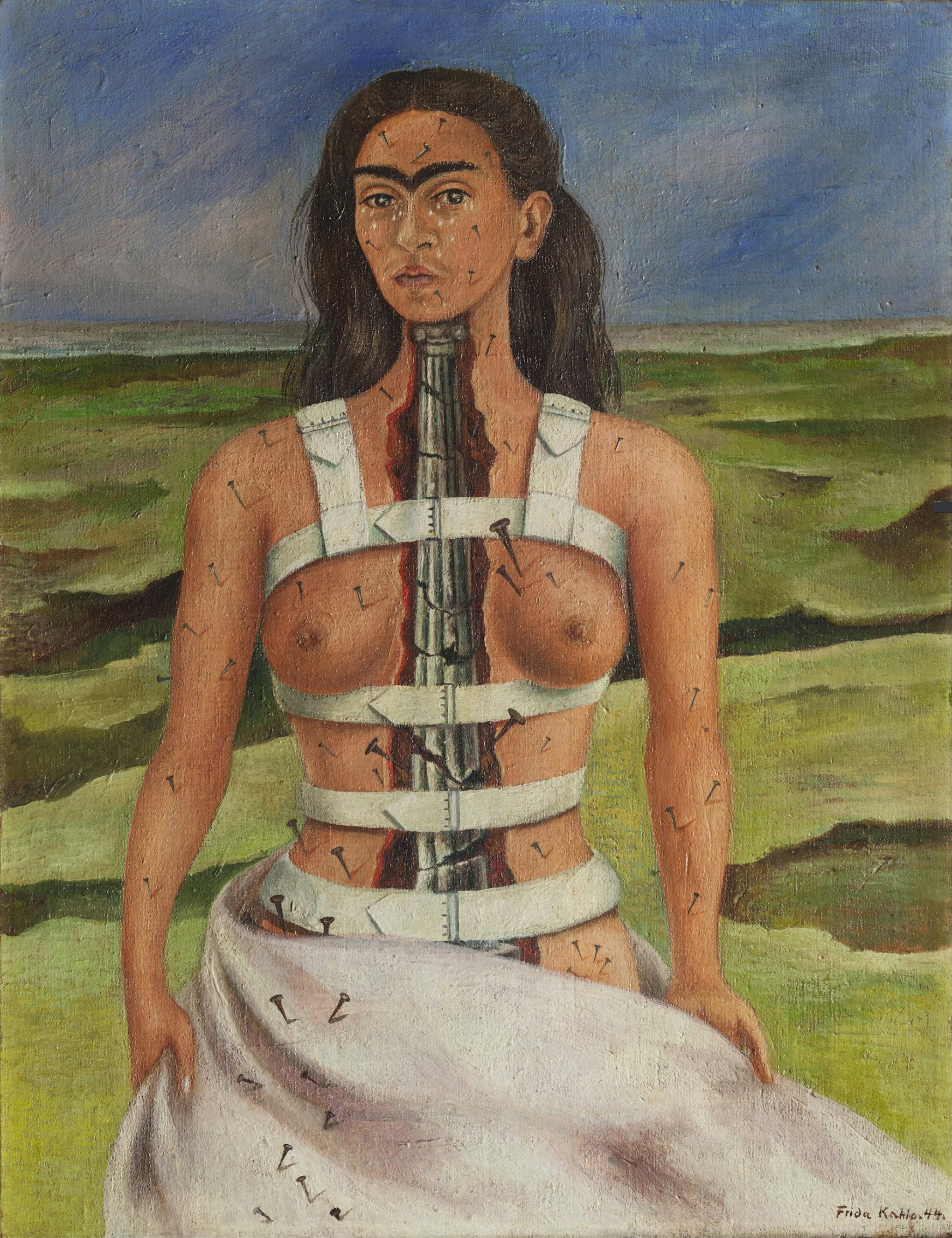 Slike: Autoportret sa ogrlicom od trnja, 1940; Autoportret, 1945; Autoportret, 1942; Autoportret u crvenoj plišanoj haljini, 1926; Slomljeni stub, 1944; Ranjeni jelen, 1946; Dve Fride, 1939.