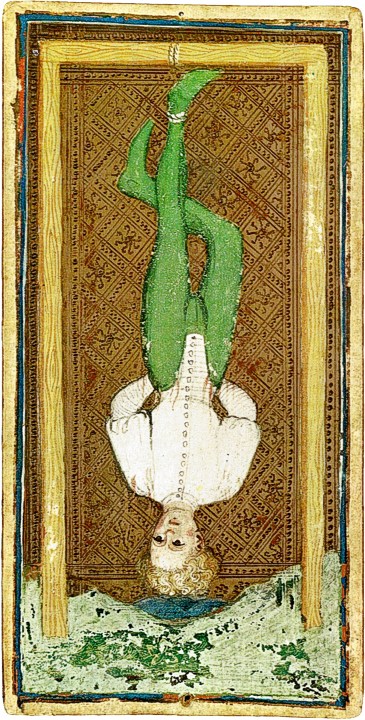 Slike: Naopako obešeni iz Vejt-Kolman špila (umetnica Pamela Kolman Smit, 1909); Naopako obešeni iz Viskonti-Sforca špila (umetnik Bonifacio Bembo, oko 1450); Naopako obešeni iz špila francuskog kralja Šarla VI (umetnik Jacquemin Gringonneur, pre 1422)