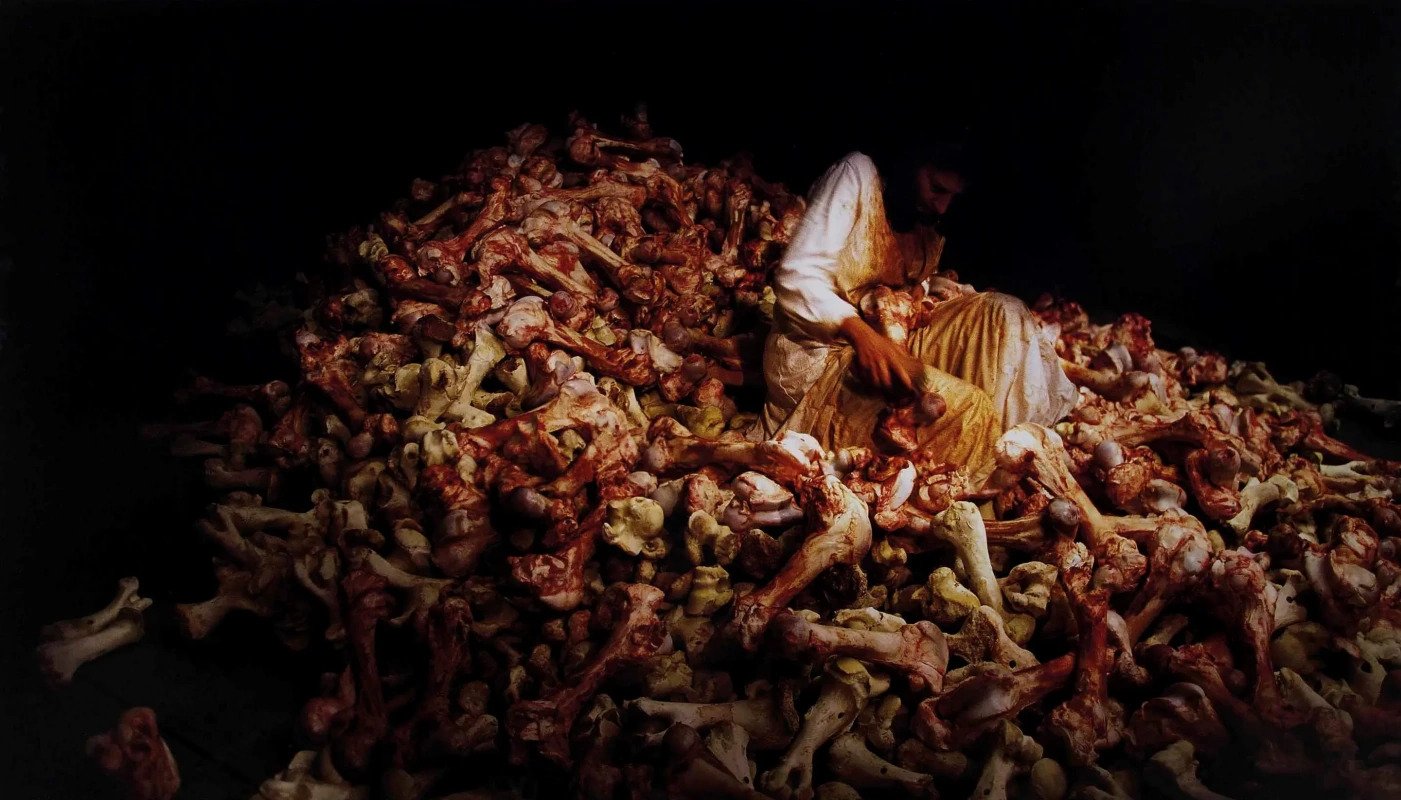 Uz tekst su bile priložene i njene fotografije: visoka žena crne kose, sanjivih očiju, tankih obrva, isuviše neutralno i „obično“ obučena da bi to bilo spontano, odsutna, „iznad situacije“ i „nezainteresovana“. Onda su na narednoj strani bile fotografije te iste žene dok sedi na gomili kostiju, na kojima su ostaci mesa i hrskavice, u beloj spavaćici, sa četkom u ruci. Pozadina je bila tamna, njena haljina bela, ali puna fleka, umrljana krvlju. Kasnije, kad god bih videla Rembrantvu sliku žene u beloj spavaćici koja ulazi u vodu setila bih se Marine Abramović koja je izvodila svoj performans Balkanski barok tokom četiri dana juna 1997. godine u Veneciji.