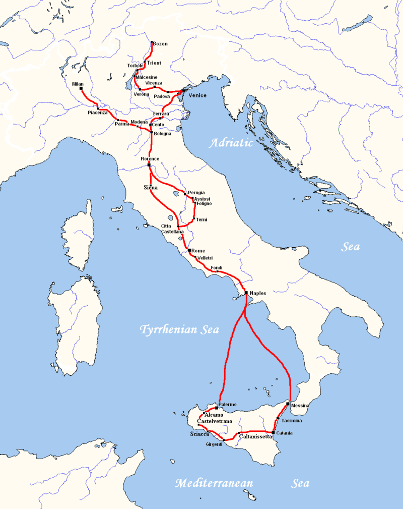 Mi ćemo na ovom mestu izostaviti detalje i opise koji su se ticali putovanja od Karlsbada do Brenera (3-14. septembar 1786.), od Verone do Venecije (16-27. septembar 1786.), boravak u Veneciji (od 28. septembra do 14. oktobra 1786.), putovanje od Ferare do Rima (Ferara, Čento, Bolonja, Peruđa, Folinjo, Terni, Čita Kastelana, gradovi koje je Gete obilazio od 16. do 28. oktobra 1786.) i samo ćemo se zadržati na pesnikovom boravku u Večnom gradu koji je započeo 1. novembra 1786. a koji je prekinut 21. februara 1787. godine da bi nastavio put ka jugu, ka Napulju (od 22. februara do 29. marta 1787.) i, kasnije, Siciliji (od 29. marta do 14. maja 1787). Odatle se Gete vraća za Napulj, gde boravi po drugi put (od 17. maja do 6. juna 1787.) i odakle, najzad, odlazi po drugi put u Rim (taj deo putovanja nije u izdanju koje smo mi koristili za ovu priliku).