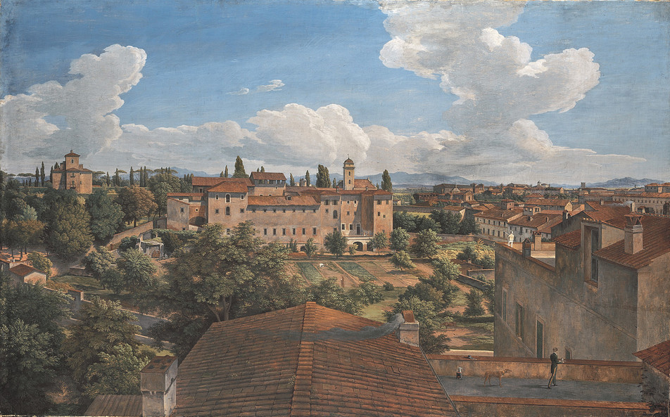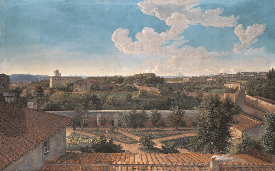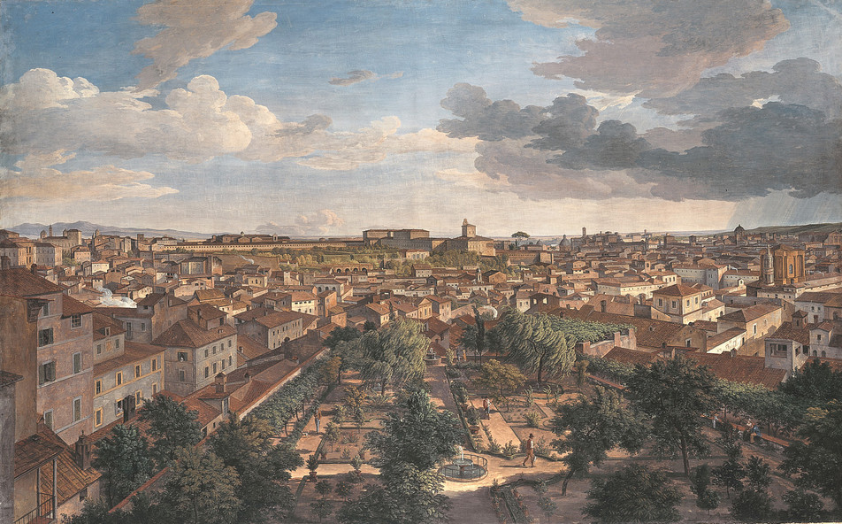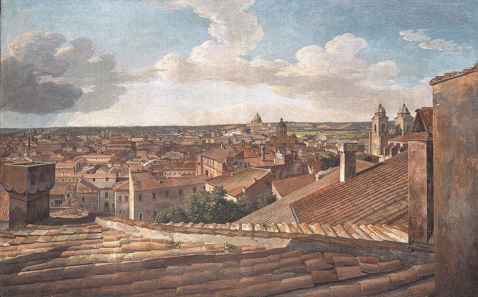 Posle crtanja na Trgu Svetog Petra, Gete i Tišbajn se penju na krov crkve i posmatraju Rim. Ta slika u naš um može prizvati na početku priložene Rajnhartove vedute, samo što je slika ovoga puta posmatrana sa suprotne strane. Rajnhartov pogled na Rim tačku gledišta zauzima sa druge strane Tibra, iz pozicije vile Malta, a sada Rim posmatraju sa suprotne strane, prekoputa, iz Vatikana.
