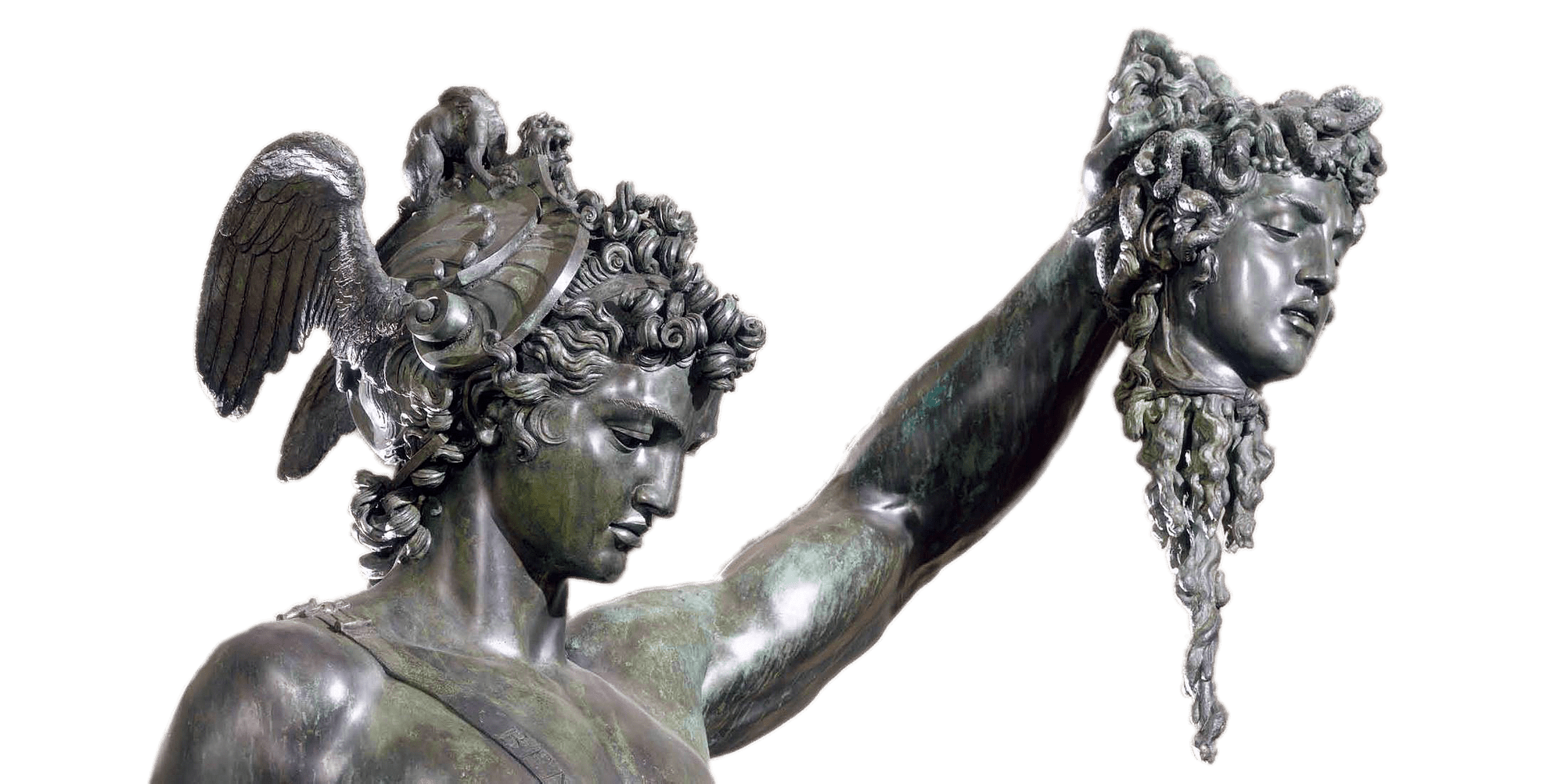 Slike: Benvenuto Čelini, Persej sa Meduzinom glavom, 1554; Antonio Kanova, Persej sa Meduzinom glavom, 1800; Pol Darde, Večni bol, 1913; Loran Markez, Persej ubija Meduzu, 1903; Lučano Garbati, Meduza sa Persejevom glavom, 2007.