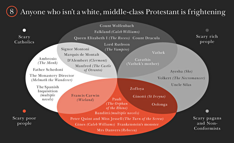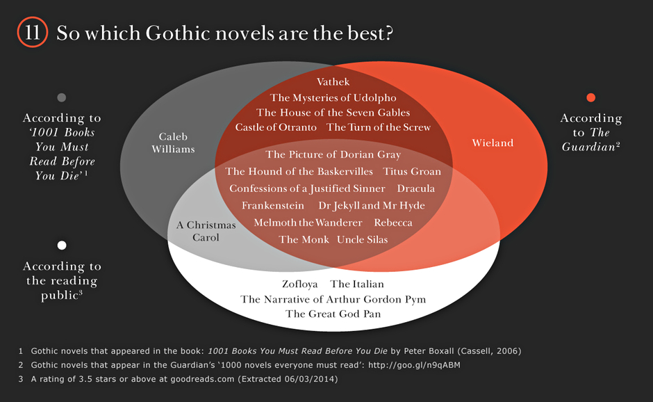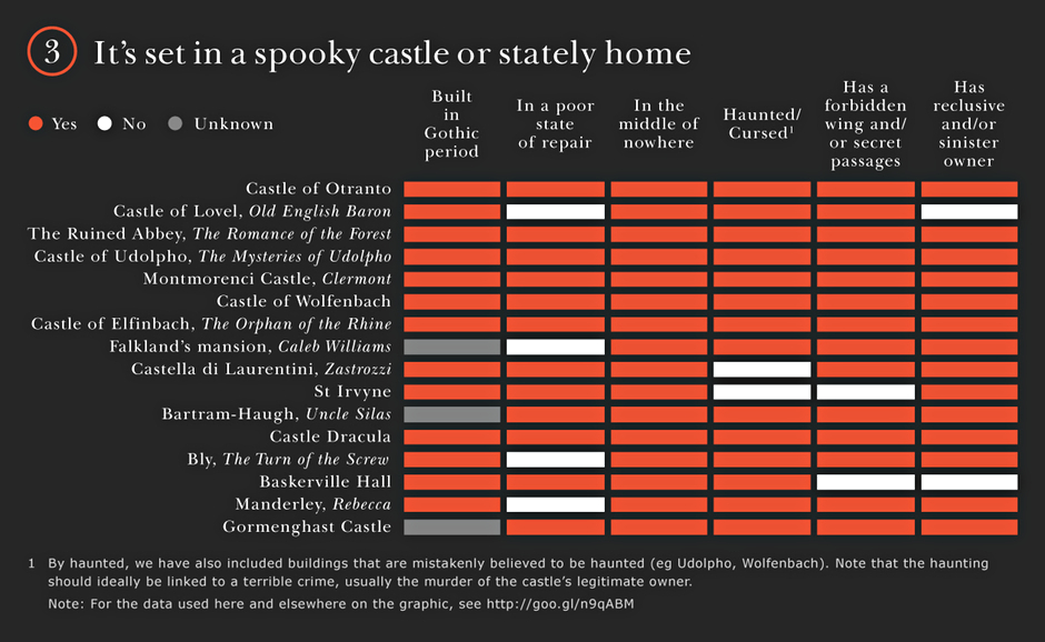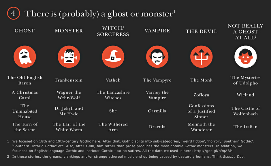 U nastavku sledi infografika koja na odličan način raspoređuje sve odlike gotske kniiževnosti. Njeni autori su Adam Frost i Zenia Vasiliev (Guardian)