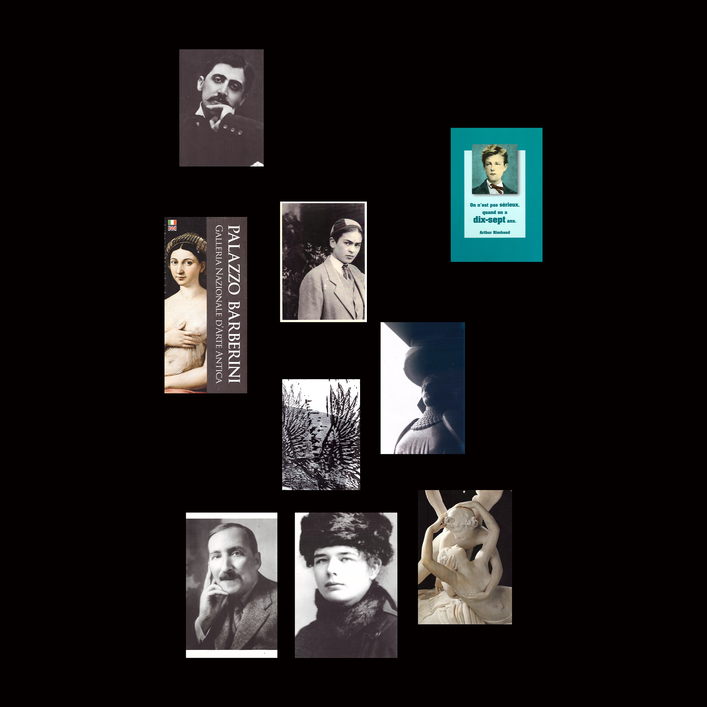 Ovo su neki od likovnih priloga koji su se našli u knjizi. Ja verujem da se i slike mogu čitati, ne samo tekst. Ovako raspoređene omaž su istoričaru umetnosti Abiju Varburgu. One prave direktnu aluziju na njegovo delo Atlas Mnemosyne i objedinjuju ono što je meni važno: